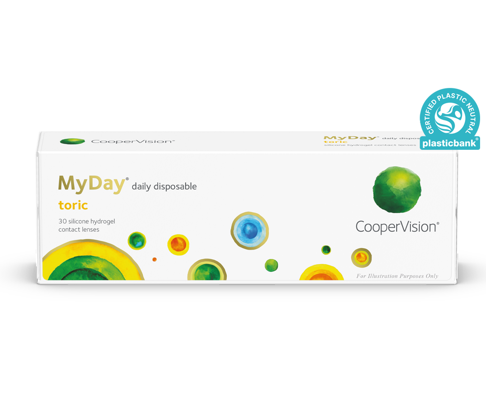 - MyDay® toric es plástico neutro. CooperVision compensa los residuos plásticos por cada caja de lentes de contacto MyDay® toric vendida y distribuida.‡‡2